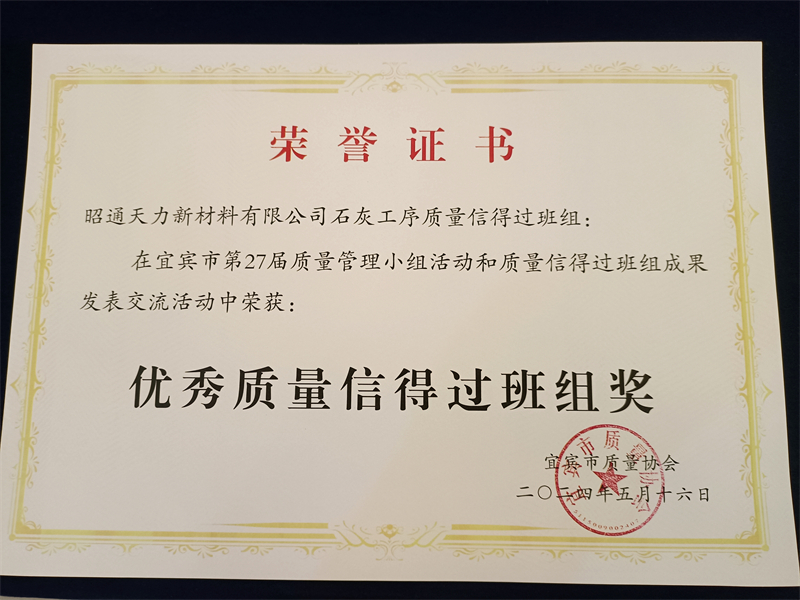 天力新质料“石灰工序质量信得过班组”荣获“优秀质量信得过班组”