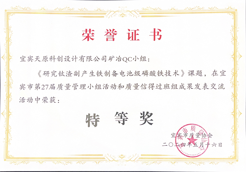 科创设计公司“研究钛渣副爆发铁制备电池级磷酸铁技术”课题荣获QC结果“特等奖”